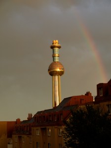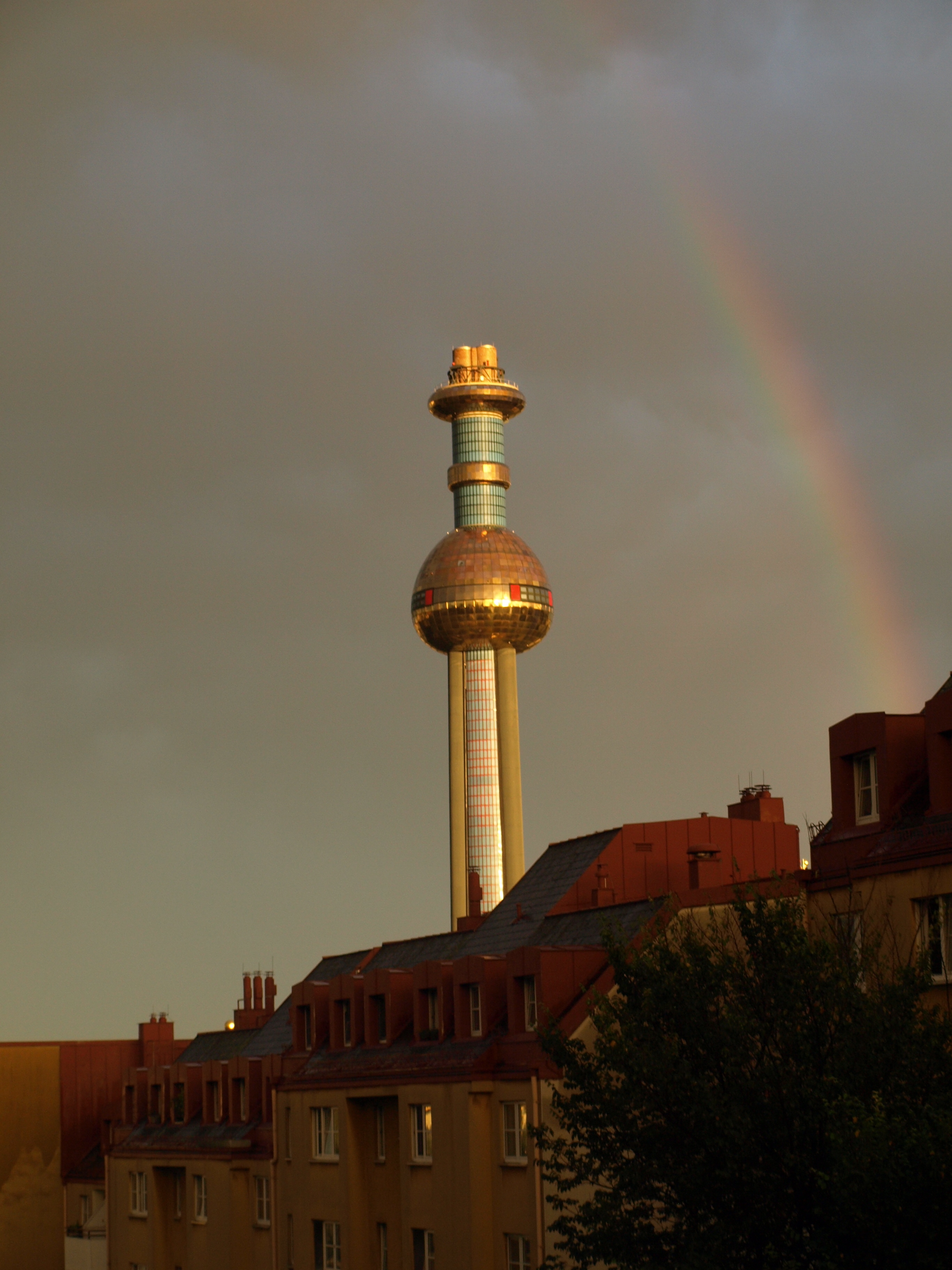 A golden tower and a rainbow