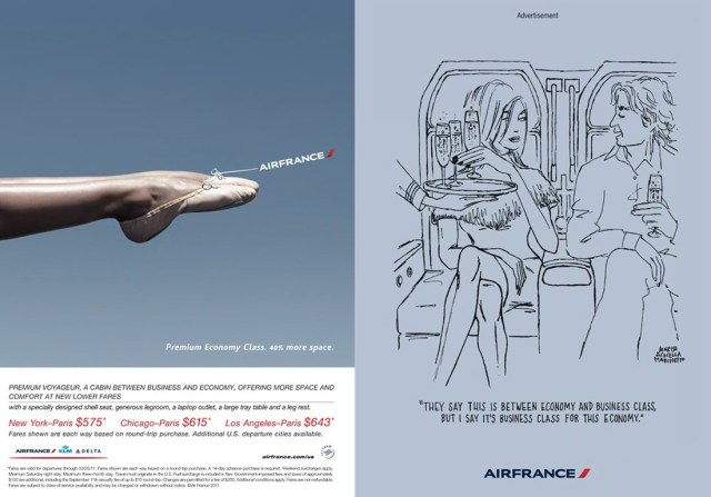 I love to look at the symbolism in advertisements. They do give a message, don’t they ? AirFrance has discovered the “concept” of space while ago and it has realised the paradoxical dichotomy of their passengers being shuttled through clear airspace, being strapped in a narrow seat and crammed in sardine boxes. So it plays on two important “labels” – elegant luxury ( flying to Paris) and the limitless freedom of s.p.a.c.e