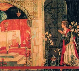 ” No man can relate to the Grail in a permanent way if his mother complex intervenes between him and his native, masculine strength. It is to take twenty years if arduous knight-errantry to get Parsifal’s homespun garment removed so he can be the strong male who can stand the beauty of the Grail – the great symbol of the mother archetype. So long as one is clothed in mother’s homespun, he cannot partake of the Grail other than the occasional chance encounter. Nor can he heal the Fisher King wound. the remaining years of adventure Parsifal experiences are all moving toward the removal of that homespun. One has a chance again at the Grail castle in middle age. The Grail is always near one and available at any moment, but sixteen and forty five, times of change, seems to be the two points in a man’s life when it is most easily found. ” (excerpted from R. A. Johnson “He”)